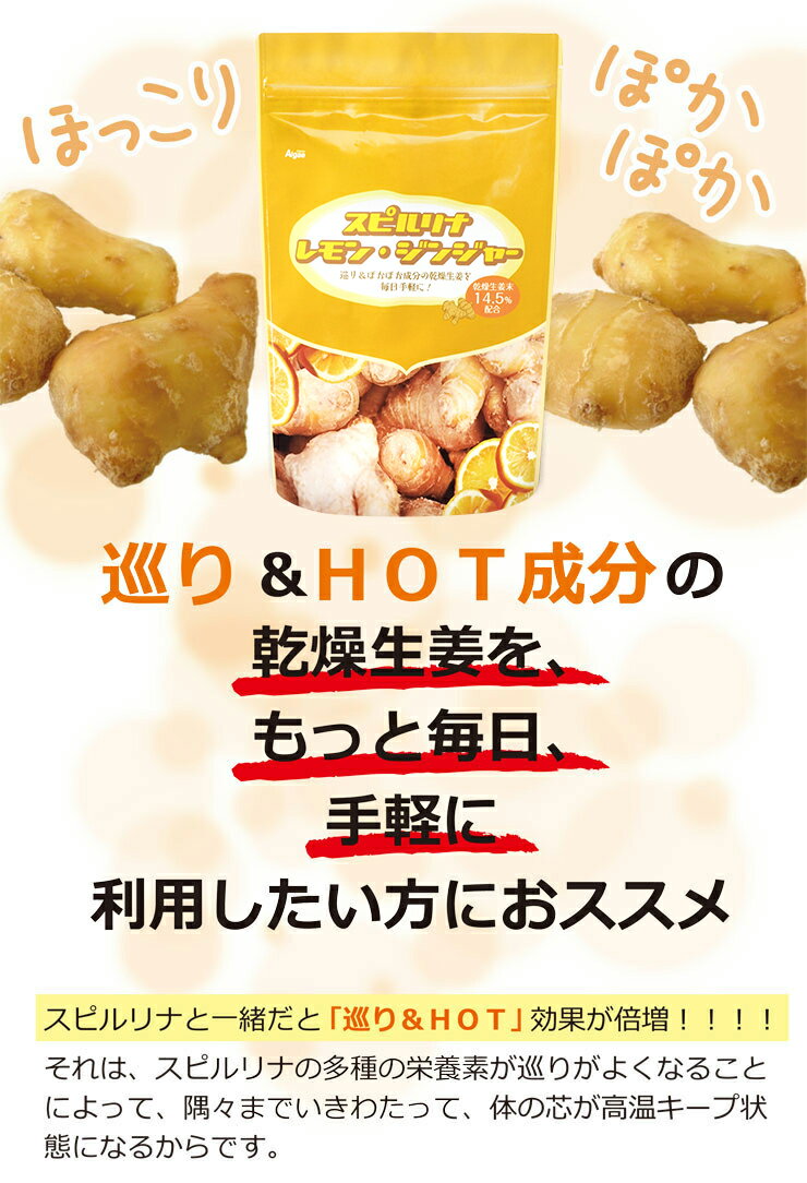 」 商品名 スピルリナ・レモンジンジャー 名称 スピルリナ加工食品 原材料 スピルリナ原末、ショウガ末、レモン果汁パウダー、ビタミンC 内容量 1800粒 (1粒200mg×1800=360g) 成分 スピルリナに含まれる約60種類以上の栄養素、ショウガ末14.5%と、レモン果汁パウダーを配合しました。